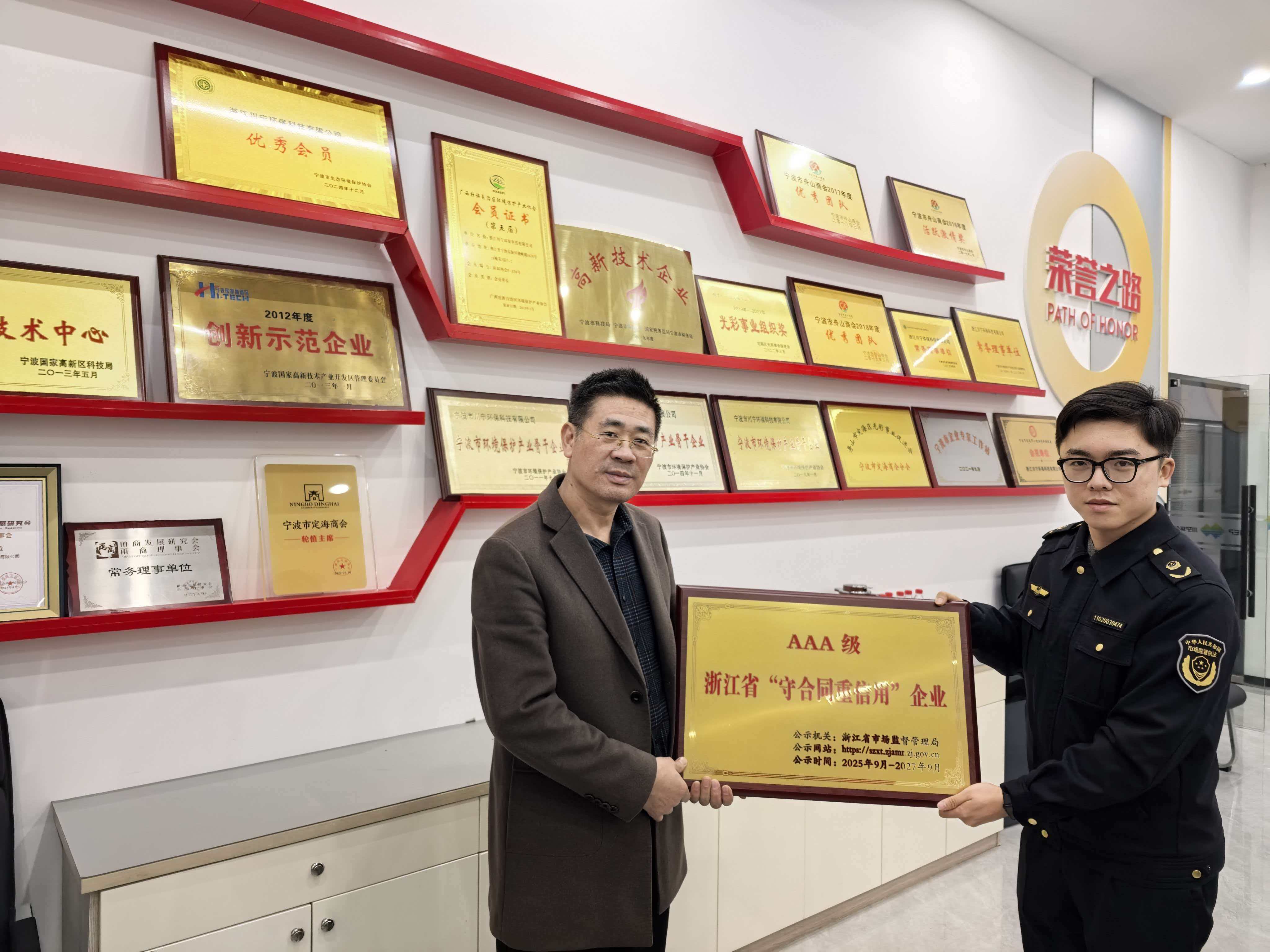 12月24日,寧波市高新區(qū)市場監(jiān)督管理局領(lǐng)導蒞臨浙江川寧環(huán)??萍加邢薰?,向我司頒發(fā)—浙江省AAA級“守合同重信用”榮譽牌匾。